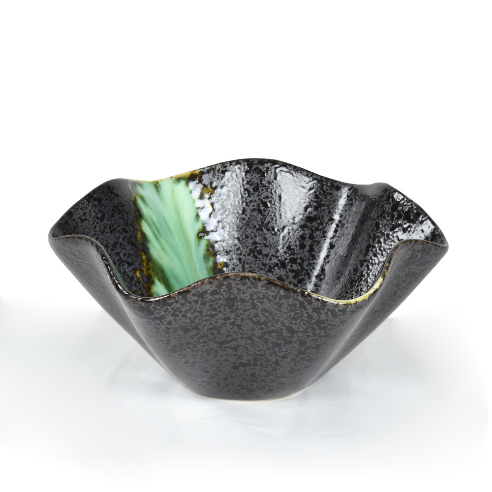 Ikebana Bowl “Irregular hexagon wave” Design. 15.6 cm x 6.8cmH. Color: Black/Green/Brown Mix.