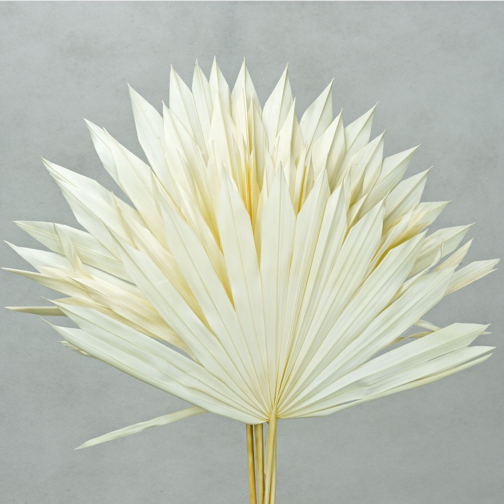Palm Sun Leaves – Off White. Leave Size: 17-37cm W x 12-18cm H. Length: 30-45cm. (abt 5 stms per Packet)