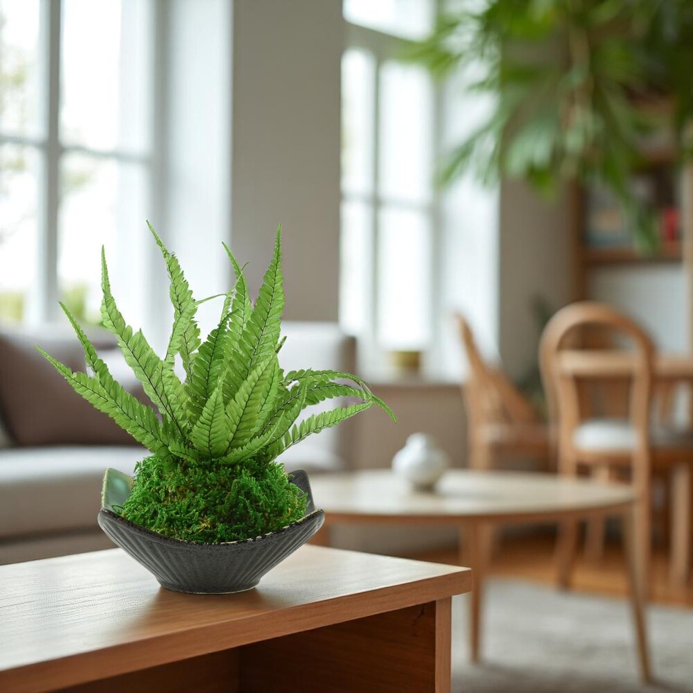 Preserved Mini Fern in Kokedama. (M). Color: Green. Size: Aprox 13.5cm x 13.5cm x 21cmH.