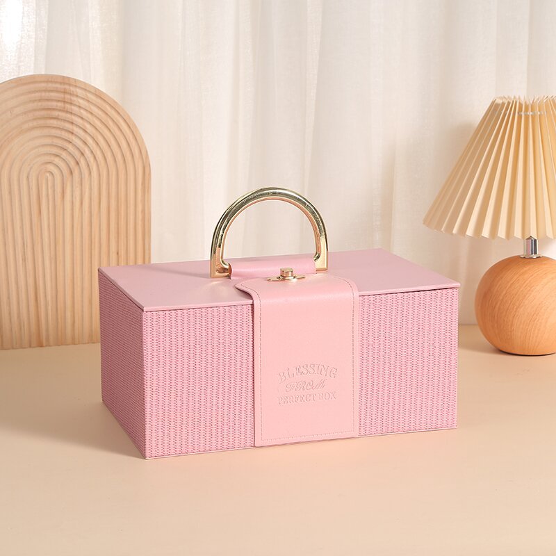 Rectangle – PU Leather Gifts Box w/Semi-Round Handle. Color: Pink. Size: 30x20x13.5cmH